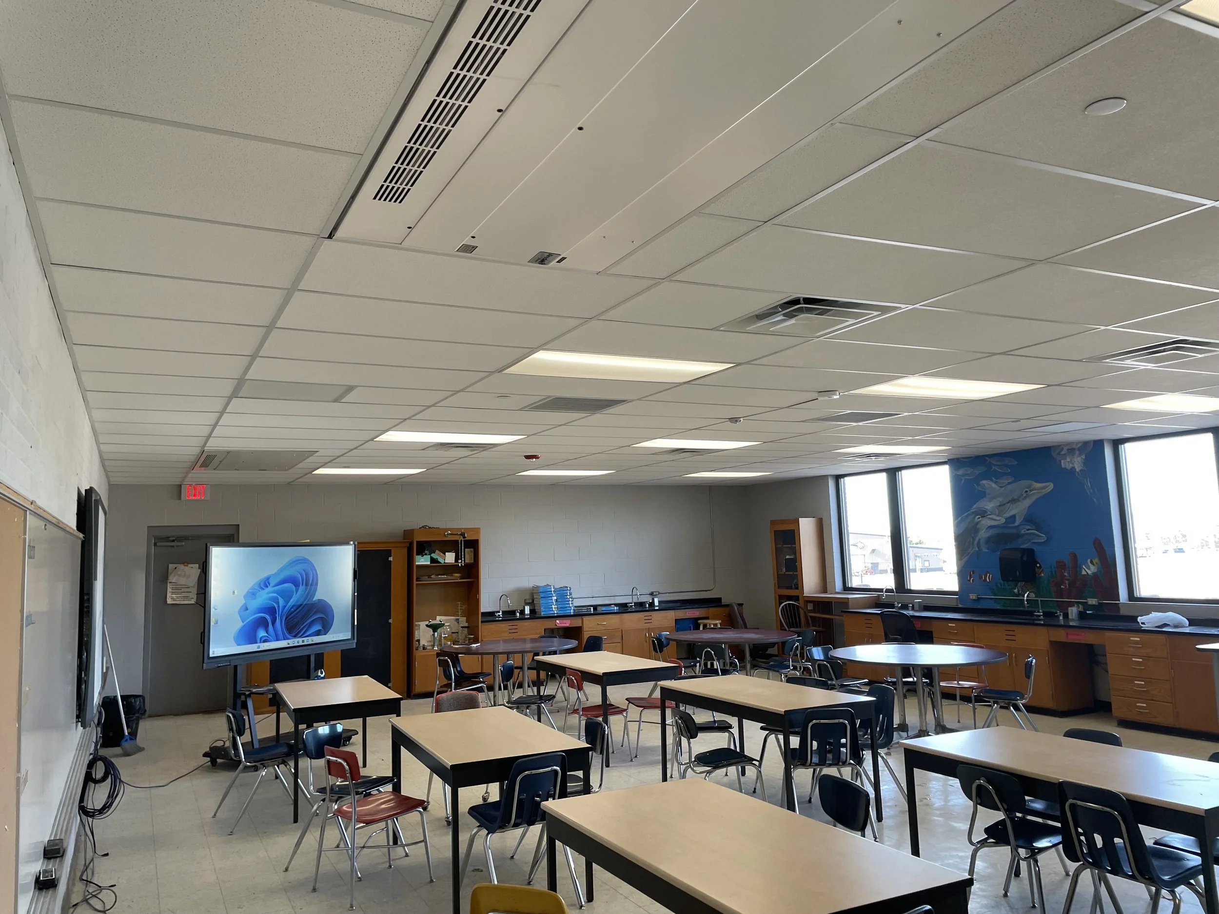 A remodeled classroom showing the removal of outdated equipment, upgraded ceilings, fresh paint, energy-efficient windows, and new HVAC.